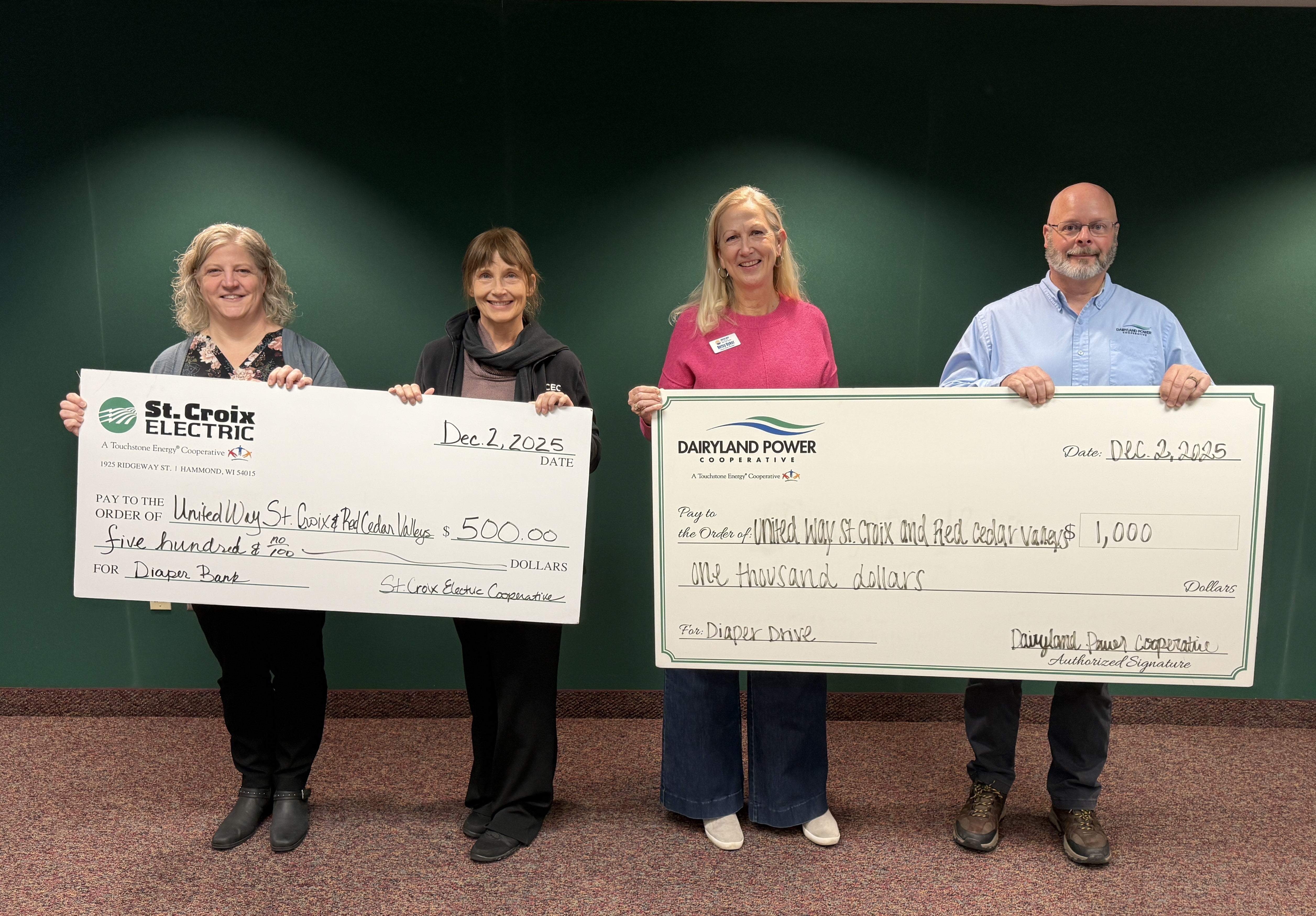 Dairyland, in collaboration with St. Croix Electric Cooperative, presented a $1,500 donation to the United Way St. Croix and Red Cedar Valleys on Tuesday, Dec. 2, demonstrating their ongoing commitment to supporting the communities they serve through the Cooperative Contributions Program.